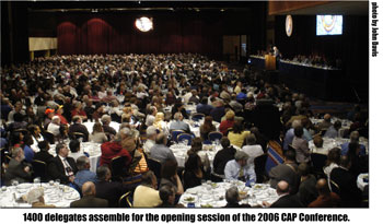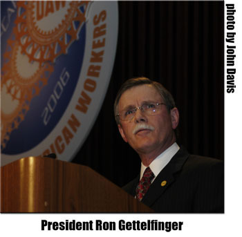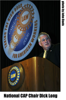 representatives. Since there was no CAP Conference in 2005, the V-CAP award for both 2004 and 2005 was given. Jim Wells of Region 5 accepted the award for both years, as Region 5 has led the UAW for a number of years in V-CAP check off. Following opening comments, Dick Long introduced International UAW President Ron Gettelfinger to give his opening address. The following remarks are paraphrased from his speech. President Ron Gettelfinger’s opening address. “It is good to see so many delegates here from local unions across the country. Over the next three days you will be receiving a great deal of information on issues that are key to working American families this year. With this being an election year, the significance of this conference is even greater. We must elect candidates that are interested in the issues of America’s working families. We need candidates that are interested