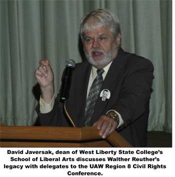 on West When the time came to develop the materials for the study, David Javersak, dean of West Liberty State College’s School of Liberal Arts was tapped to provide the curriculum. Dean Javersak graded from West Virginia Southern College in 1967, with Walter Reuther being the commencement speaker. “What impressed me the most at the time was the fact that here was a man in his 60s, at the height of his career, the confidante of the sitting president at the time, Lyndon Baines Johnson, he knew the movers and shakers and he introduces his father and mother,” Dean Javersak told the delegates of the UAW Region 8 Civil Rights Conference on the morning before the dedication. “Reuther was a man that was on the cover of Time Magazine — “not once but twice” — in 1948 and 1955 and in September 1995, was awarded the Presidential Medal of Freedom by the Clinton administration, named to Time Magazines top 100 people of the 20th century and holds a place on the Wall Street Journal’s “Gallery of the Greatest Business Leaders” along side the captains of industry such as D. Rockefeller, Alexander Graham Bell, Thomas Edison and Carnegie. This man from Wheeling never forgot where he came from or who he was working for. At this commencement ceremony in 1967 he recognized his parents Valentine and Hannah in the audience. It’s difficult to take on the Communists, mobsters